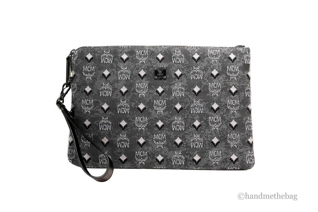 Elevate your accessory game with the MCM Veritas Medium Dark Grey Denim Monogram Logo Canvas Clutch Pouch...